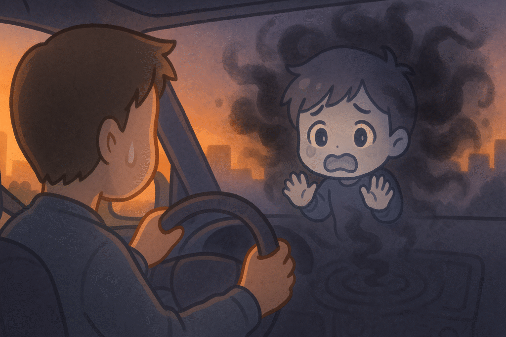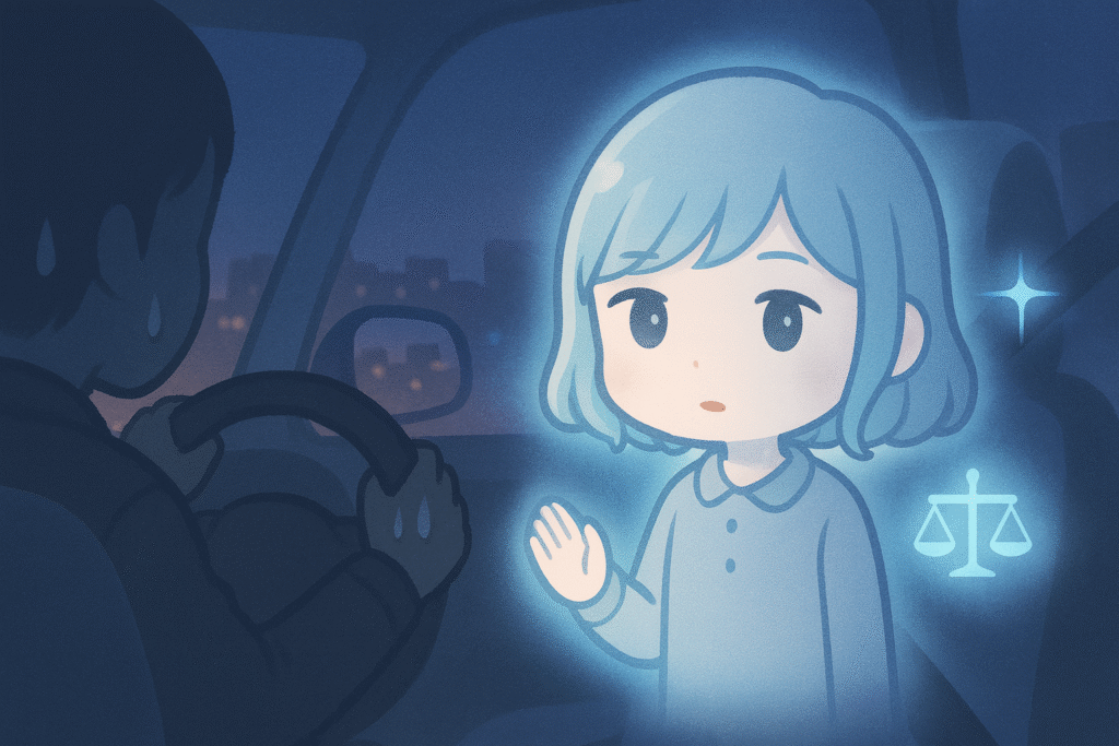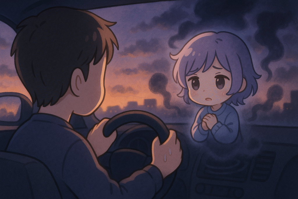 ラジオの音が遠のき、車内の空気が妙に重く感じる。心の中に黒い波紋が広がっていく。